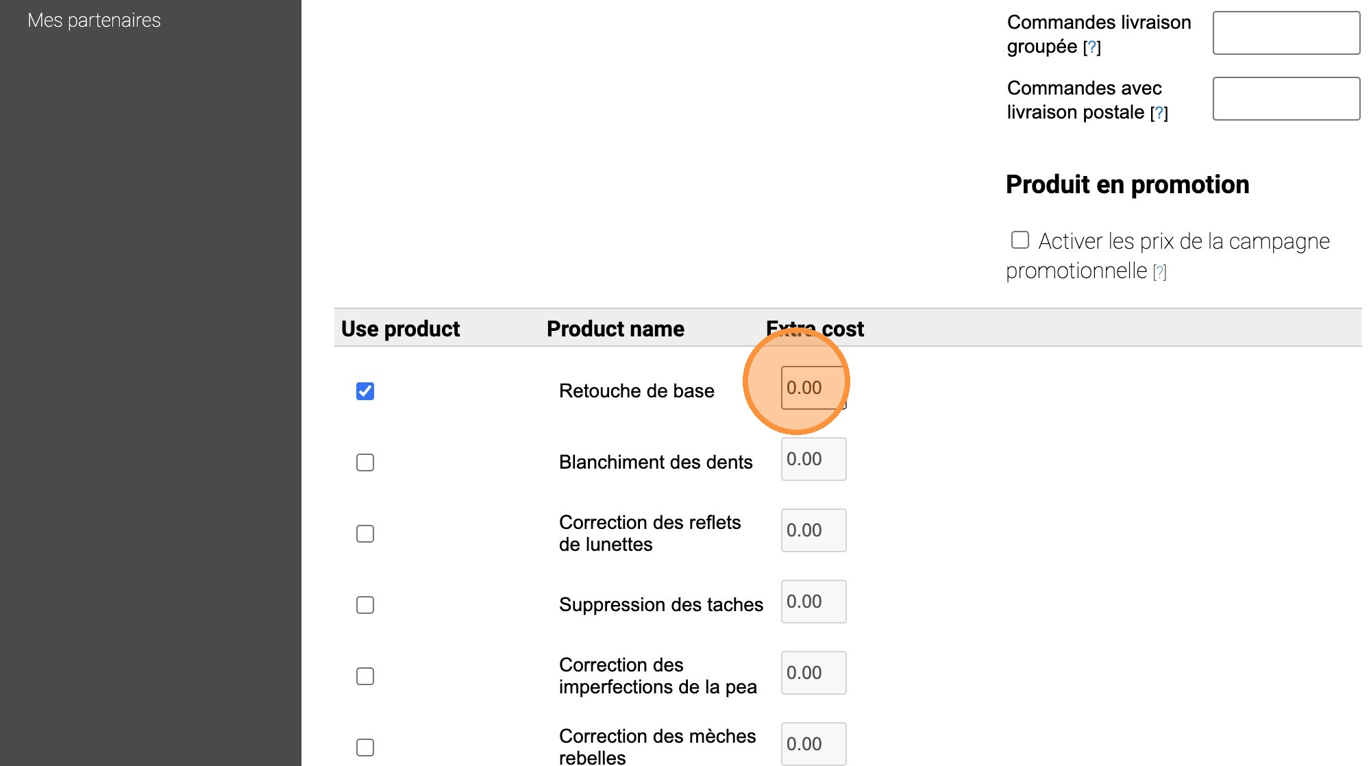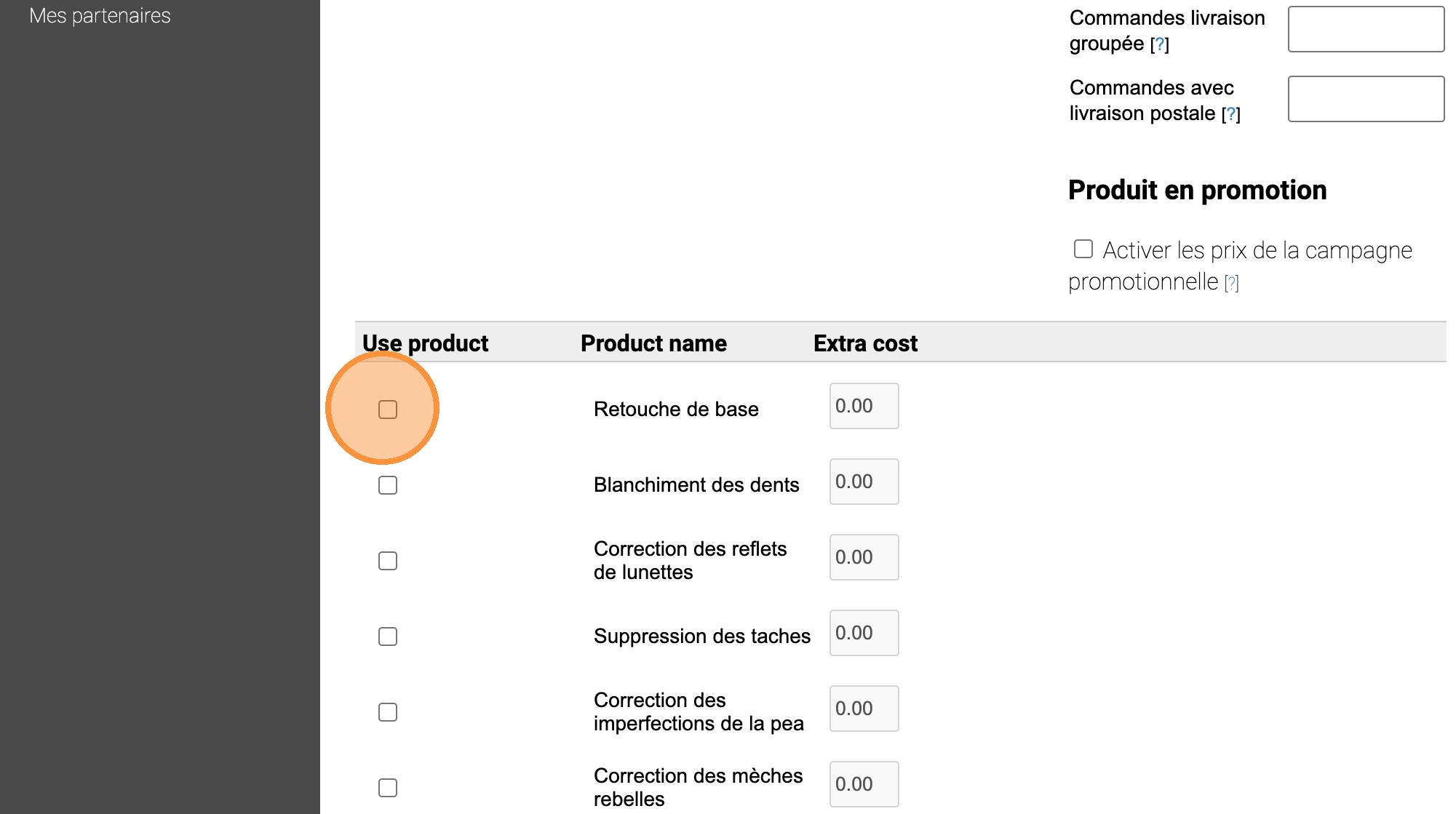 8. Sélectionnez le service désiré, le cocher et y ajouter le prix. Seuls les services cochés seront visibles au client. Assurez-vous d'avoir un prix supérieur à 0$ pour chaque item coché. Si le client choisit plusieurs options, les coûts s'additionneront.